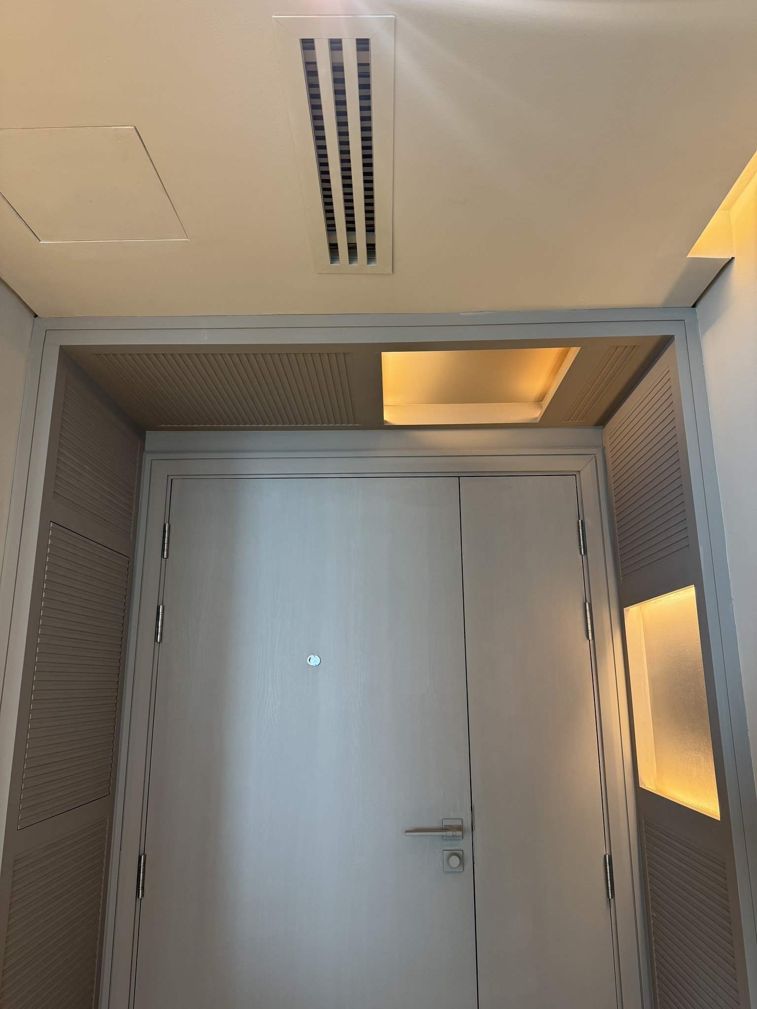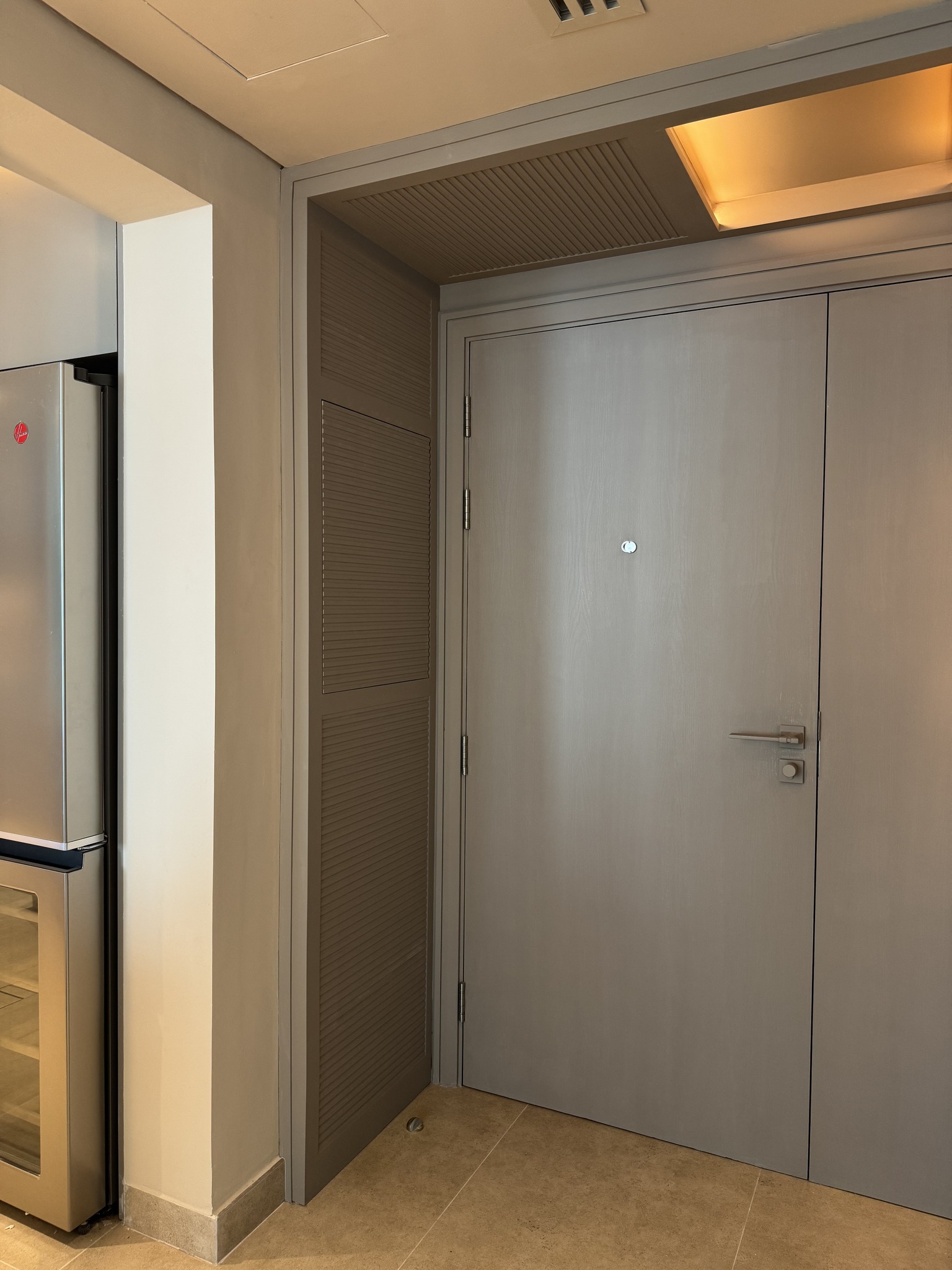 To further enhance the entrance, we meticulously framed the walls and ceiling on either side of the entrance door. The wall paneling work included elegant LED lighting installations, adding warmth and sophistication to the space. Additionally, a niche was created within the ceiling paneling to house subtle warm white LED lighting, creating a soft, ambient glow. The double entrance doors were also painted in Jotun | Macchiato, ensuring they blended seamlessly with the surrounding wall paneling works.