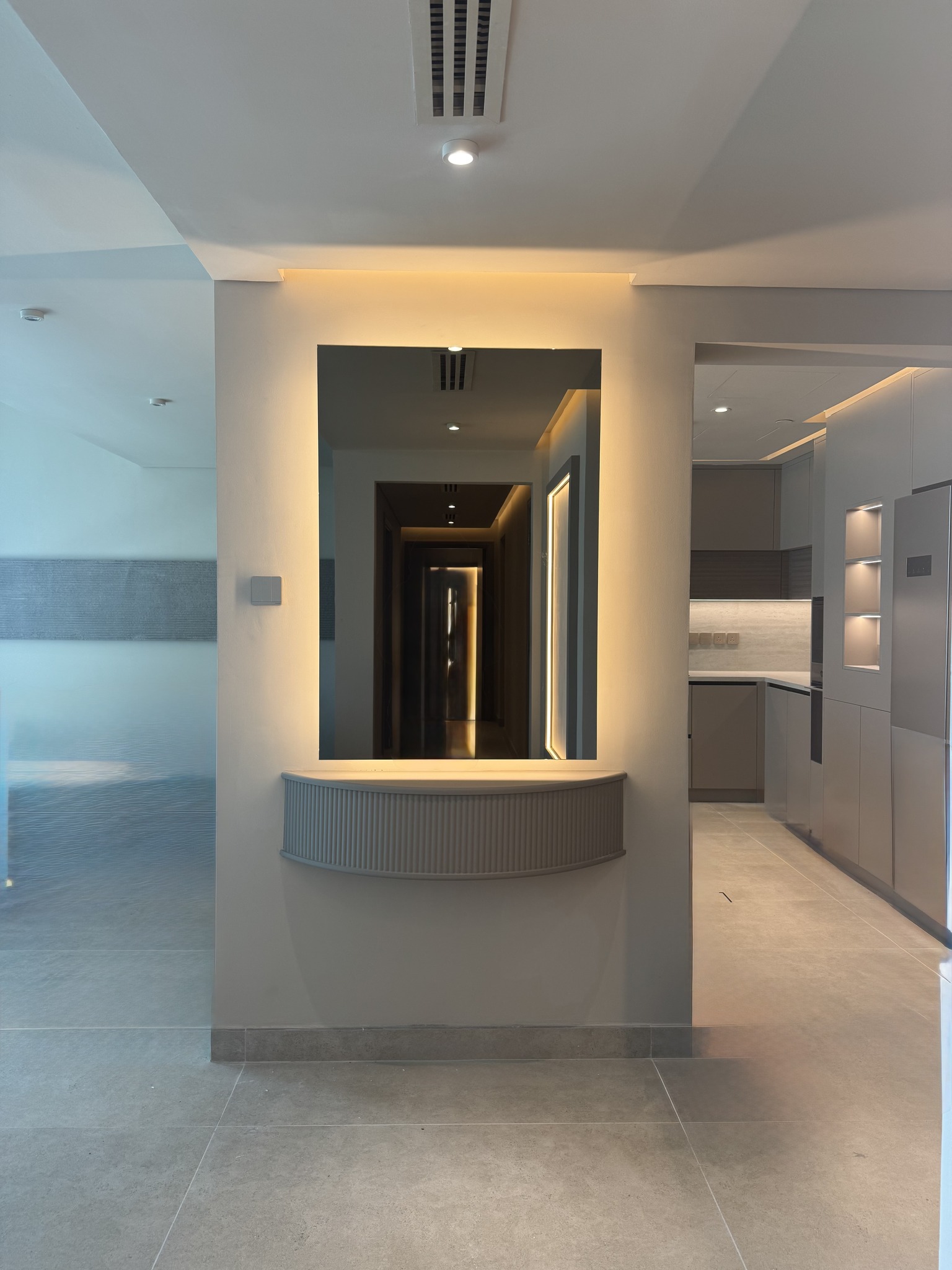 At Al Bateen Residences, Jumeirah Beach Residence (JBR), we delivered expert custom-made wall paneling solutions that seamlessly blended elegance and functionality. Our wall paneling works featured premium Jotun | Macchiato paint, integrated LED lighting works, and a touch of luxury with customized mirror works and DB hiding techniques.