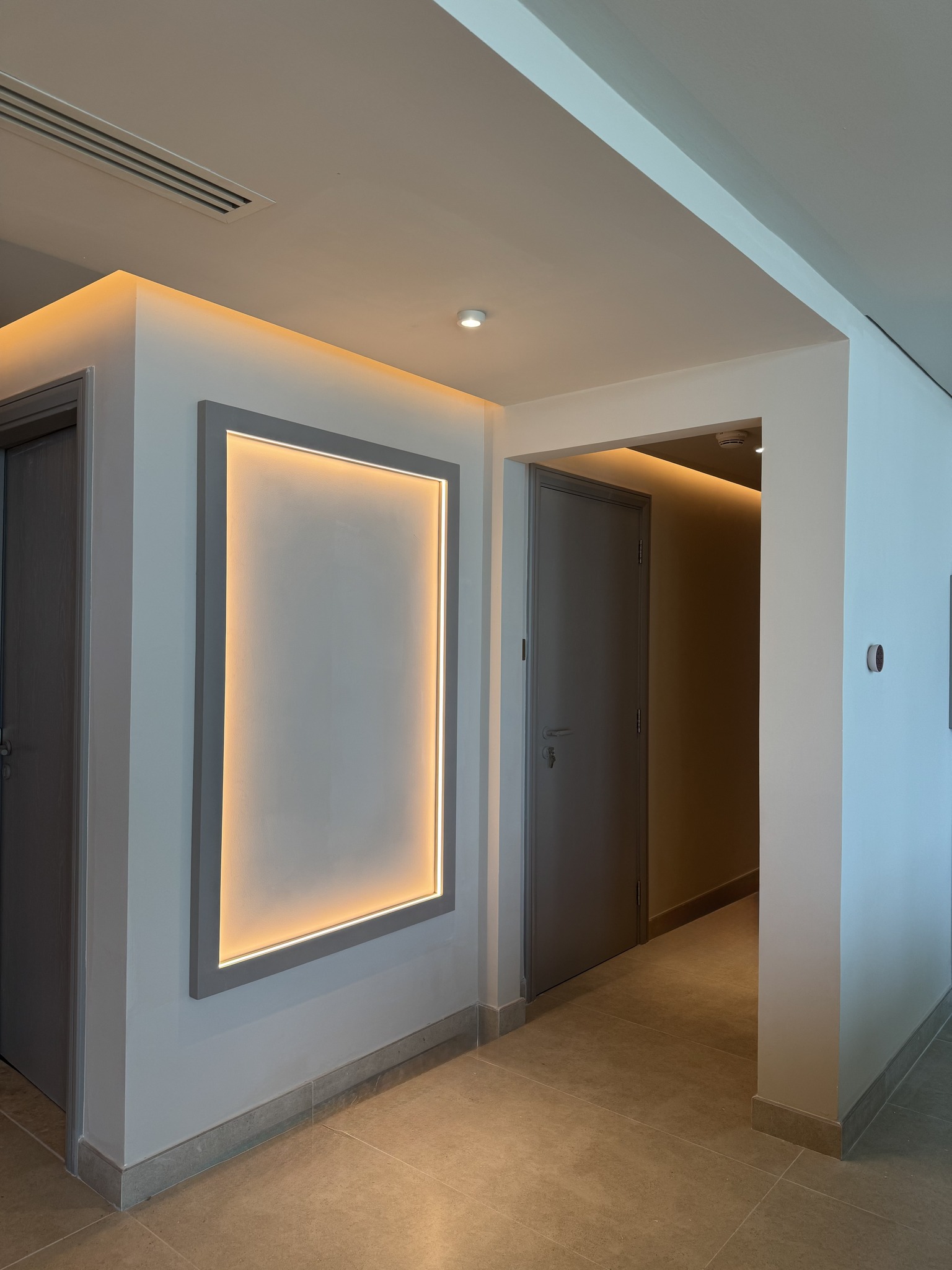 We designed and installed a stunning wall paneling feature in the hall, incorporating MDF framing and warm white LED lighting works. This paneling was carefully crafted to add depth and dimension, enhancing the space with a refined aesthetic. To complement the luxurious interiors of JBR, we used Jotun | Macchiato paint for a seamless, sophisticated finish.